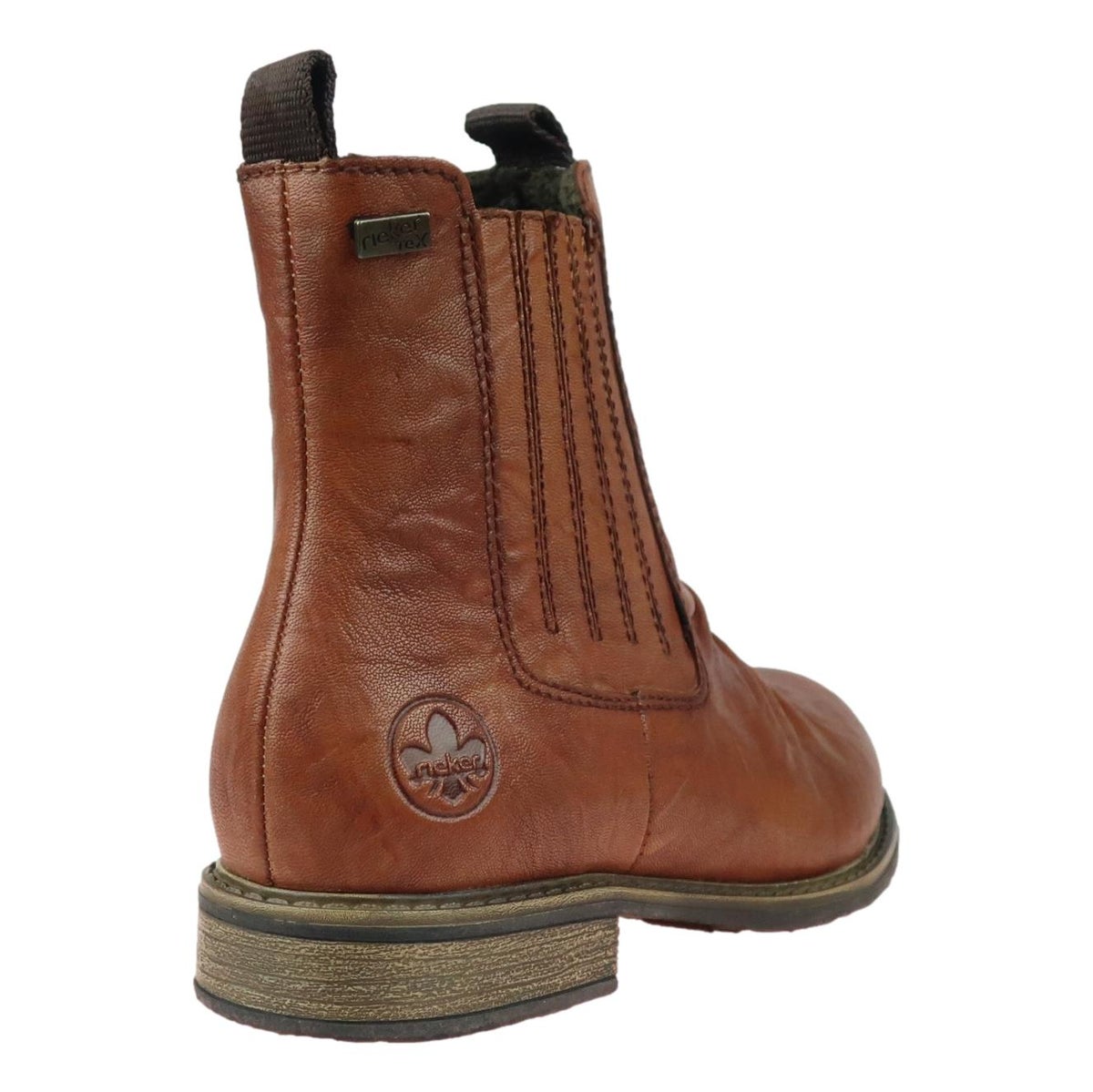 Nahkainen ruskea Rieker nilkkuri venykkeillä, tilavalla lestillä ja pitävällä pohjalla. Tässä nilkkurissa materiaalit ovat huippuluokkaa: pehmeää nahkaa ja vetoketju helpottamassa pukemista. Tyylikäs ja mukava käyttökenkä jokapäiväiseen menoon.