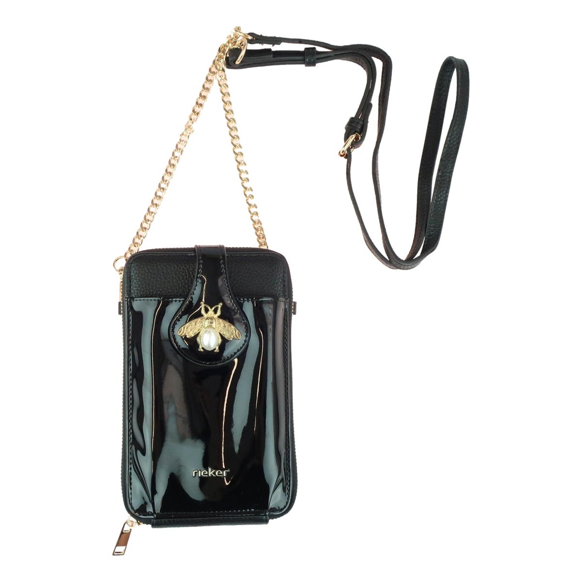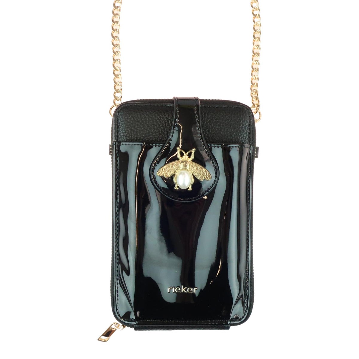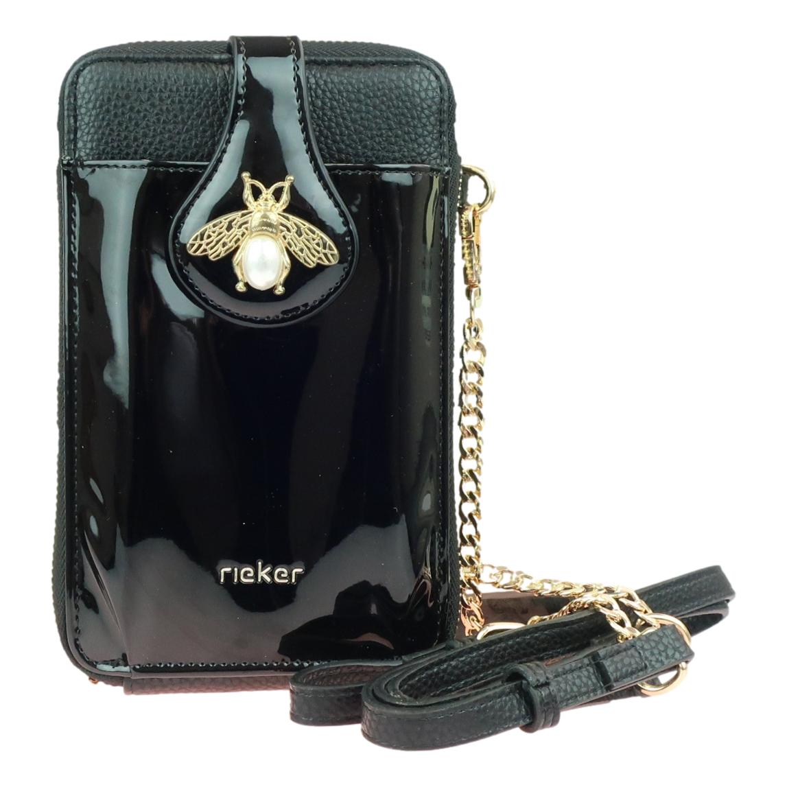 Kaunis ja käytännöllinen pieni Rieker olkalaukku/lompakko/puhelinlaukku. Musta on klassisen tyylikäs valinta ja tekeekin tästä laukusta todella monikäyttöisen. Kokonsa puolesta sinne mahtuu pienet päivittäiset tavarat kuten meikit, puhelin, jne. Laukun sisällä kaksi lokeroa ja paikat luottokorteille. Laukussa on täyspitkä vetoketju jonka ansiosta tavarat pysyvät hyvin sisällä. Laukun edessä on tasku magneettiläpällä johon saa kätevästi puhelimen. Kaunis olkahihna viimeistelee ulkonäön. Tämä on erinomainen valinta kun tarvitset pienen laukun esim juhliin tai lomareissuille.